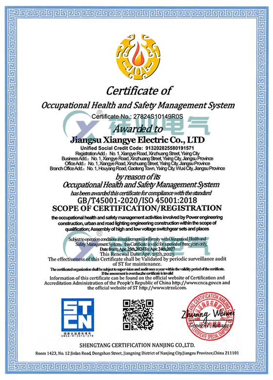 职业健康安全管理体系认证证书